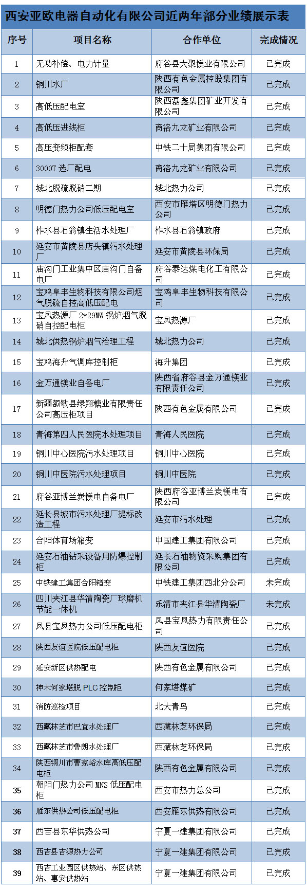西安亞歐電氣設(shè)備集團有限公司近兩年部分業(yè)績展示表